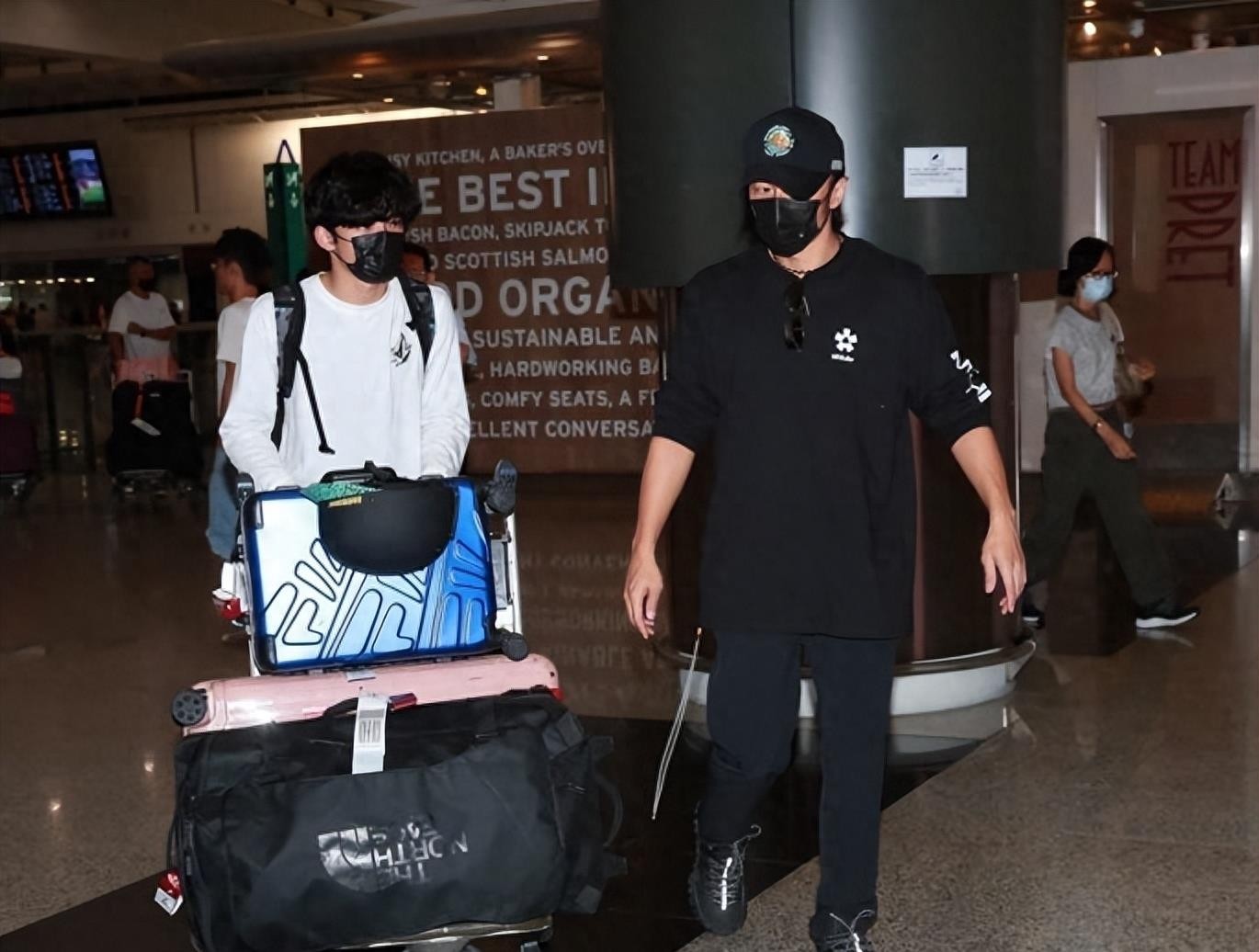 3日晚10点左右,谢霆锋父子抵达香港机场。父亲穿着黑色衣服,儿子穿着白色衣服。两人都戴着口罩,没有直接坐在镜头前。