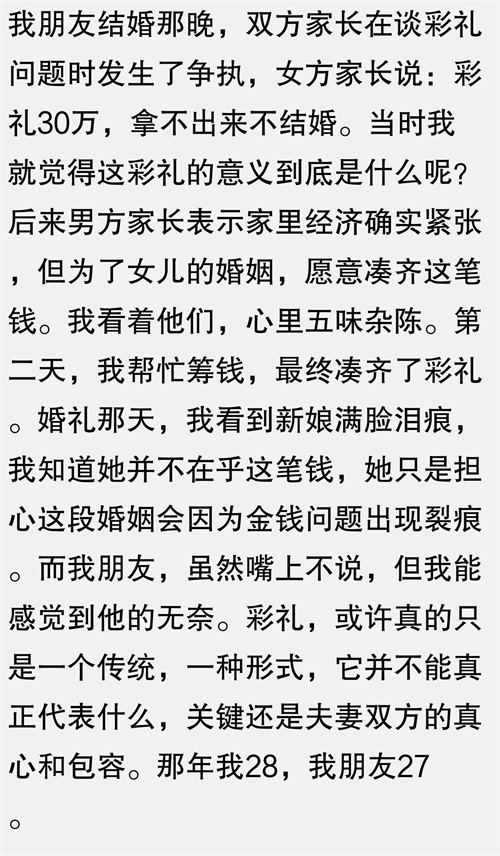 我朋友结婚那会儿,男方家长一开口就是彩礼30万,拿不出来不结婚,我当时就震惊了。然后我就说:哎呀,这彩礼数额也太夸张了吧,我们年轻人结婚应该注重感情,不是金钱嘛。结果男方家长说:不,彩礼是传统,是我们对女方家庭的尊重。然后我就开玩笑说:那咱们就尊重一下传统吧,但是30万确实有点多,能不能少点?结果男方家长态度坚决,说这是最低标准。后来我朋友为了能结婚,只能东拼西凑凑够了这笔钱。婚礼上,女方家长明显有些尴尬,毕竟这笔钱对她们来说也是一笔不小的负担。我看着这对新人的婚礼,心里不禁想:彩礼的意义,真的是金钱吗?30万,换来的可能只是一场形式上的尊重,却可能给两个新人的婚姻生活埋下隐患。那年我25,我朋友24。