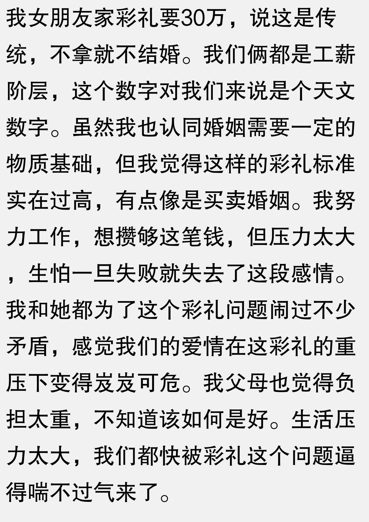 我男朋友家要求彩礼30万,说拿不出来就不结婚,我家里条件一般,实在凑不齐,他妈妈就不同意,我男朋友也不支持,我为了爱情妥协,找朋友借了钱,没想到他妈妈后来又变卦,说我没诚意,我男朋友也对我失望,我为了彩礼的事差点和家里闹翻,最后还是分手了,我朋友借钱给我,她老公意外受伤,欠了债,我工作失误被公司辞退,现在还欠着债,生活压力巨大,真不知道彩礼的意义在哪里?