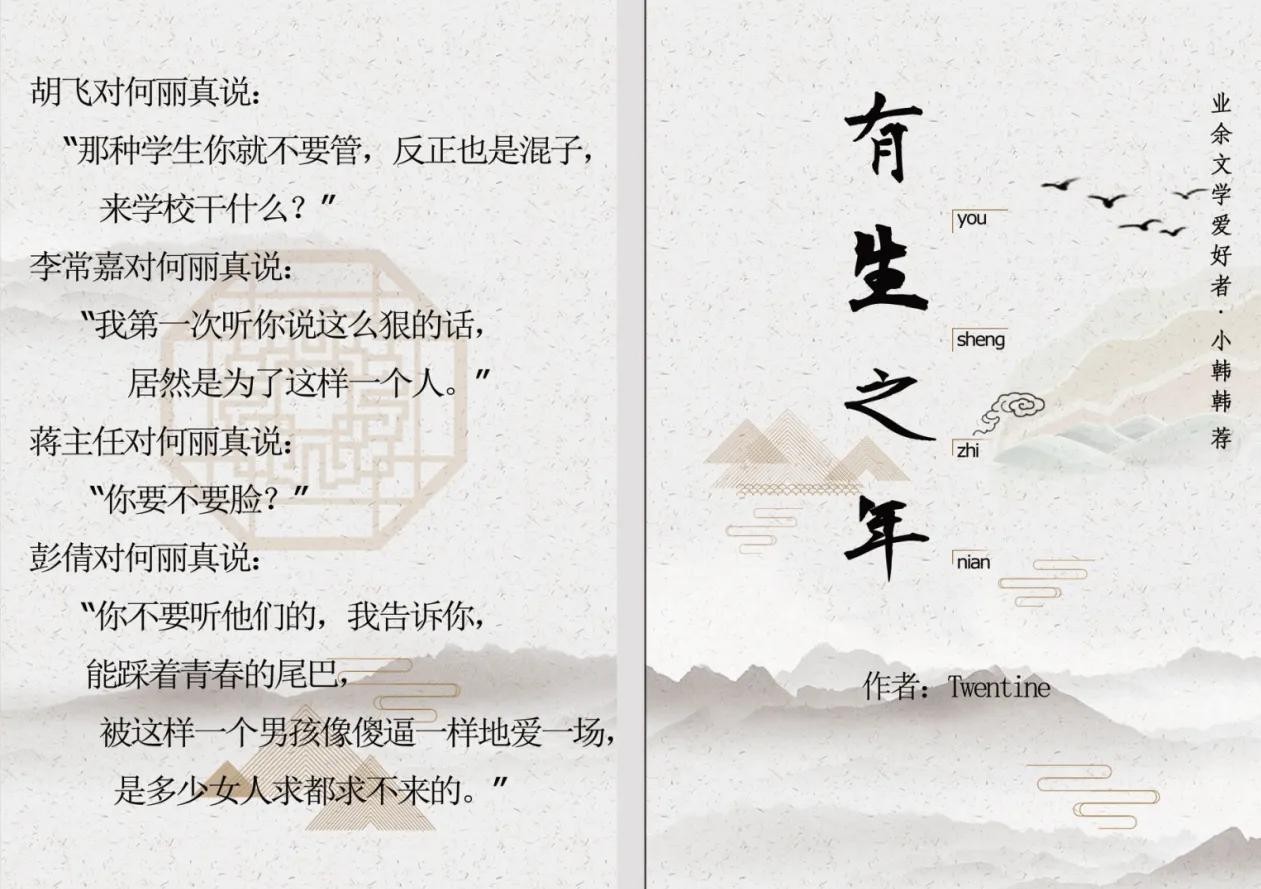 Twentine文里都是小人物,没有离奇强大的背景,没有金手指,人设也不完美,像是你我身边的甲乙丙丁,身处泥泞,匍匐前行,心向阳光。