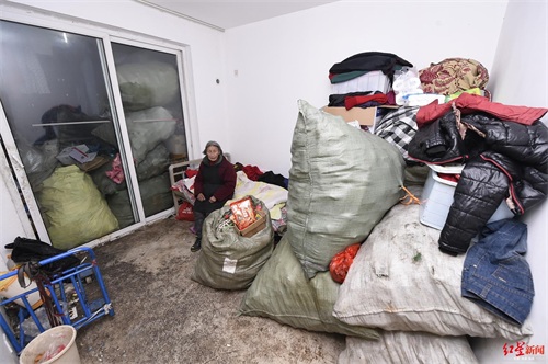 蒋婆婆居住的卧室堆满了杂物和捡拾来的垃圾
