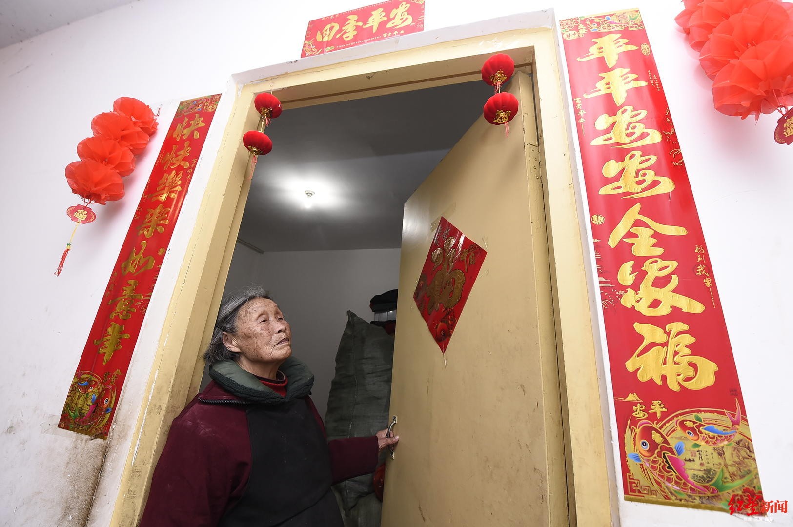 昨日(1月14日),进屋后没多久,志愿者们放下采购的香肠腊肉、大米佐料等年货,开始帮蒋婆婆贴新年的福字。这一次看望蒋婆婆的人里仍然有蒲斌,从2013年开始,他所在的四川益路同行慈善服务中心便开始帮扶蒋婆婆。为她找房子、带去爱心物资,直到2017年底,蒋婆婆的故事被大众所知,蒲斌的电话被打爆,越来越多的人为蒋婆婆送去帮助。