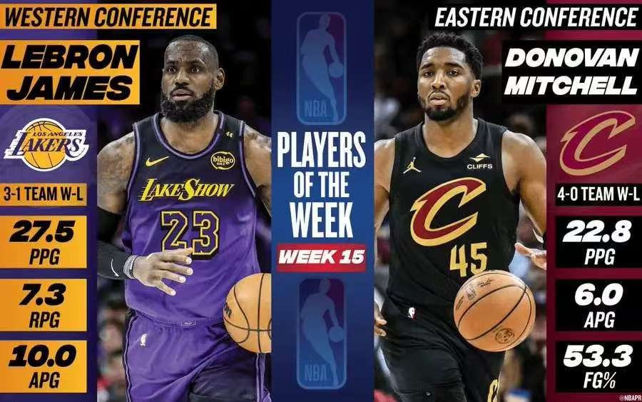 今天联盟官方还公布了周最佳,詹姆斯和米切尔分别当选了,詹姆斯上周在浓眉长期缺阵的情况下,带队3胜1负,场均可以拿下27.5分7.3篮板10助攻的数据,米切尔上周带队取得了3胜1负的战绩,场均可以拿下22.8分6助攻的数据,值得一提的是詹姆斯超越了乔丹,成为了历史上最老的周最佳球员,40岁零36天,传奇还在延续!