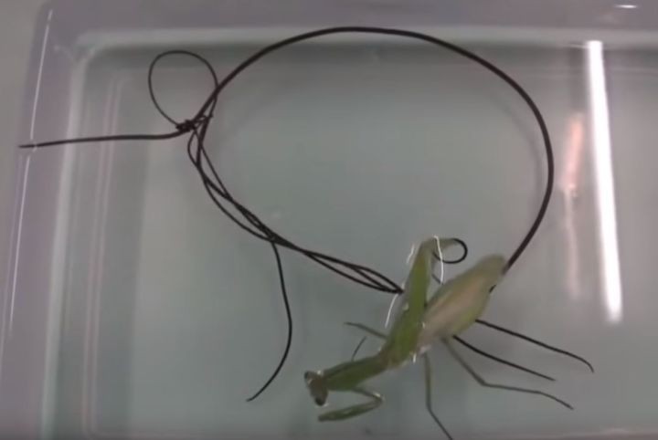 由于宿主有外骨骼的缘故并不会变得瘦骨嶙峋,我们并不会直接辨认出哪些昆虫体内存在着铁线虫,只好将昆虫泡在水里观察它的腹部会不会有异样,当被寄生的宿主浸在水中后,体内的铁线虫会得到信号变得活跃起来,坚硬的体表快速扭动下,很容易就会破体而出,这一幕属实让人感觉不适。