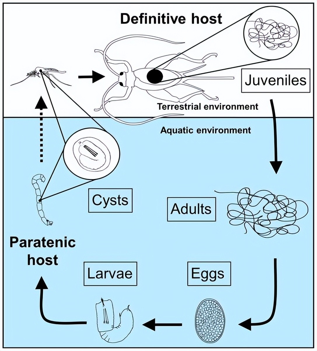 铁线虫幼虫会紧紧的贴在宿主消化道附近,疯狂的吸收营养并快速生长,被寄生的宿主会冲肚子开始一步步被“榨干”,在铁线虫成熟之前,宿主并不会提前因营养不良而死去,反而会被铁线虫将性腺破坏掉,绝育后的宿主没了繁殖的烦恼,变成了只想着进食的“称职”宿主。