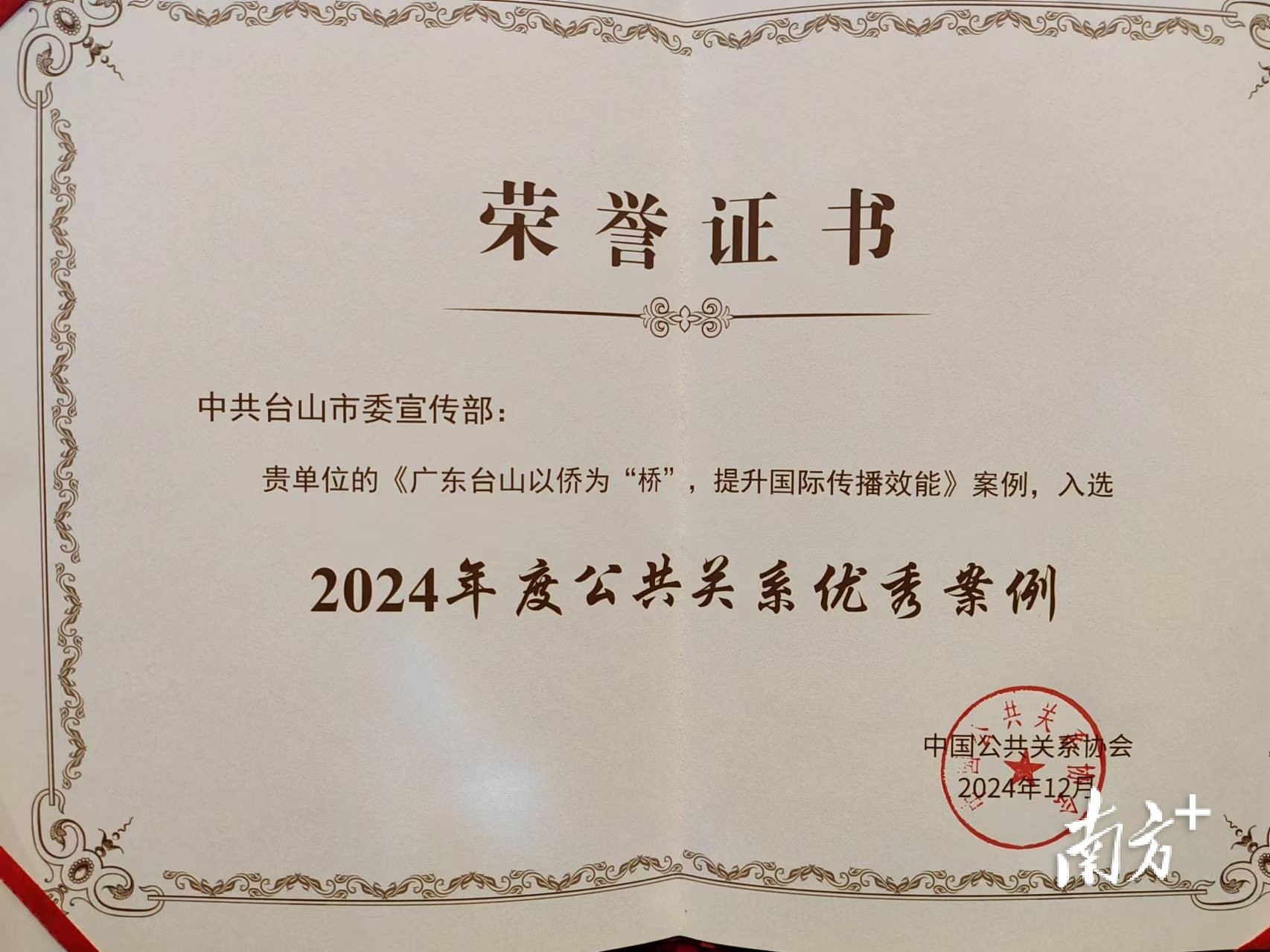 12月21日,2024中国公共关系发展大会在北京举办。会上,中国公共关系协会副会长、经济日报社原社长兼总编辑张小影现场发布了“2024年度优秀公共关系案例展示”。其中,台山市委宣传部选送的案例《广东台山以侨为“桥”,提升国际传播效能》入选2024年度优秀公共关系案例。