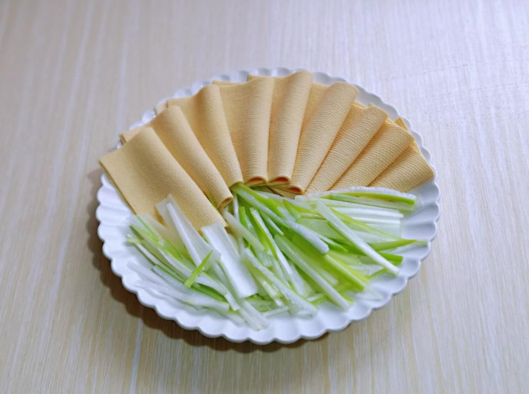 4、将葱去皮切丝,将干豆腐皮冲洗干净,切正方形放,切好的干豆腐皮用开水烫2-3分钟,再捞出淋干水分。