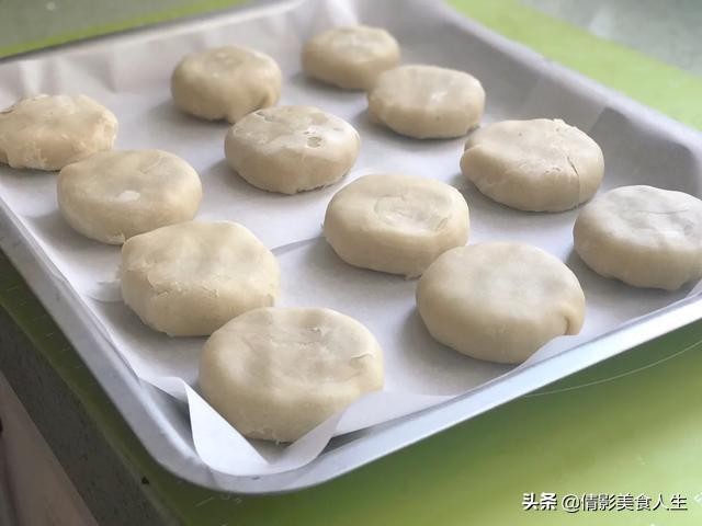 8.取一份面团,从中间按压下去,将两头按到中间,用擀面杖擀成中间厚四周薄的圆形,放上绿豆馅,把绿豆馅包裹起来揉成小球形状,然后将面团放在烤盘上,用掌心轻轻压扁,