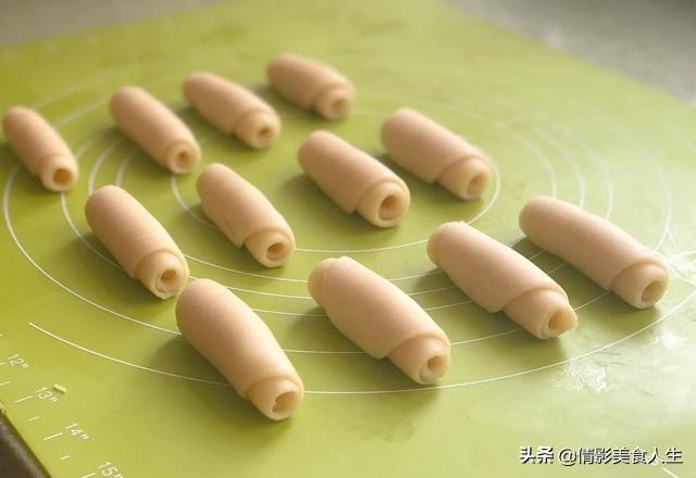 7.包好的水油皮收口朝上,用擀面杖从中间往上和往下擀开,由上往下卷起来。依次卷好所有的面团,盖上保鲜膜醒15分钟