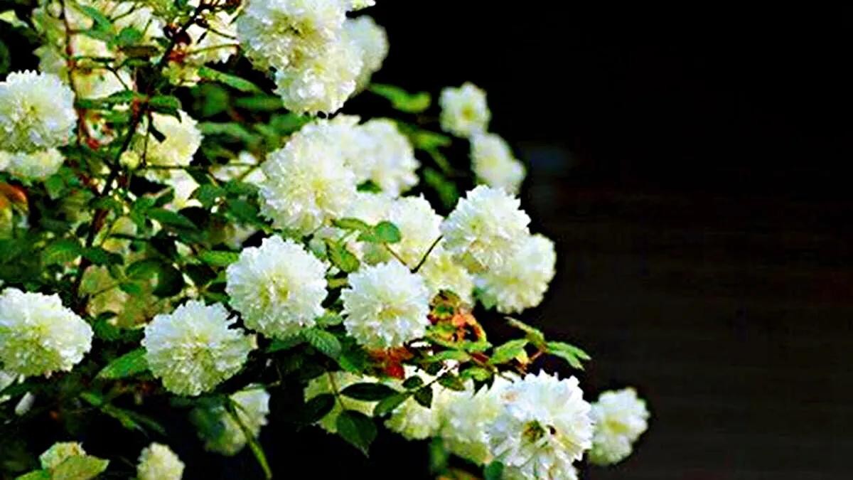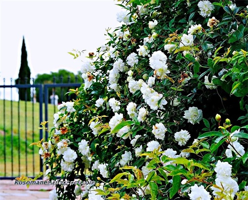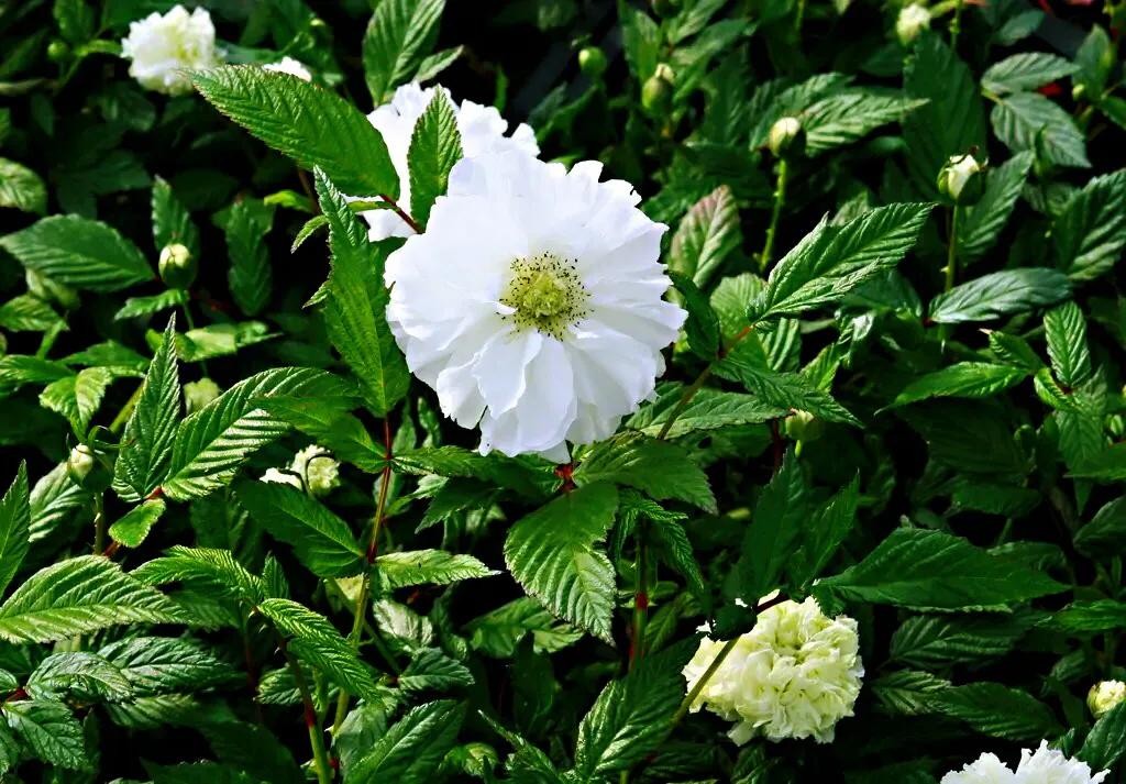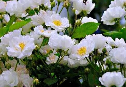 荼蘼花 枝梢茂密,花繁香浓,入秋后果色变红。宜作绿篱,也可孤植于草地边缘。