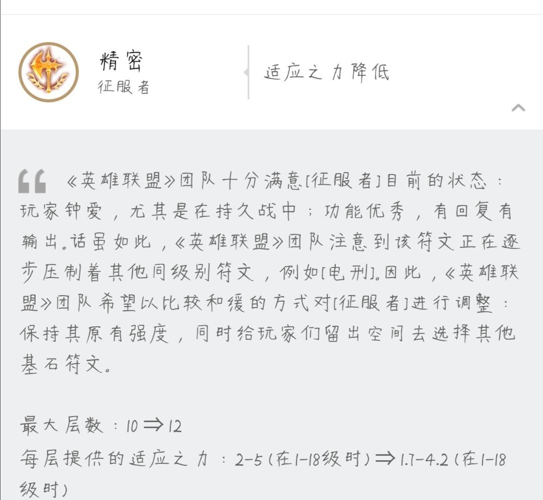 这次调整中,【征服者】的最大层数由10调整到了12,但是每层的适应之力由2—5(1—18级)调整到了1.7—4.2(在1—18级时 )。