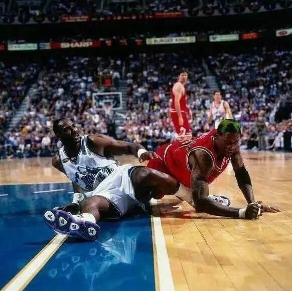 比如曾在活塞打过篮球的“大虫”罗德曼把这种风气和习惯带到了芝加哥公牛。在和爵士队打总决赛的时候,他和盐湖城的当家球星卡尔-马龙已经超出了打球的范畴,甚至相互扭打在了一起给球场擦了个人肉地板,此等场景犹如泼妇悍妇老娘们儿一般在街头闹市中撒泼打滚一样精彩。