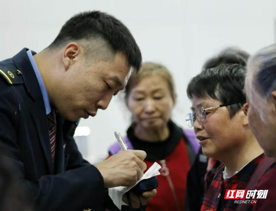 怀化南站工作人员热心地帮老年旅客手写所乘高铁的站台、座位号。