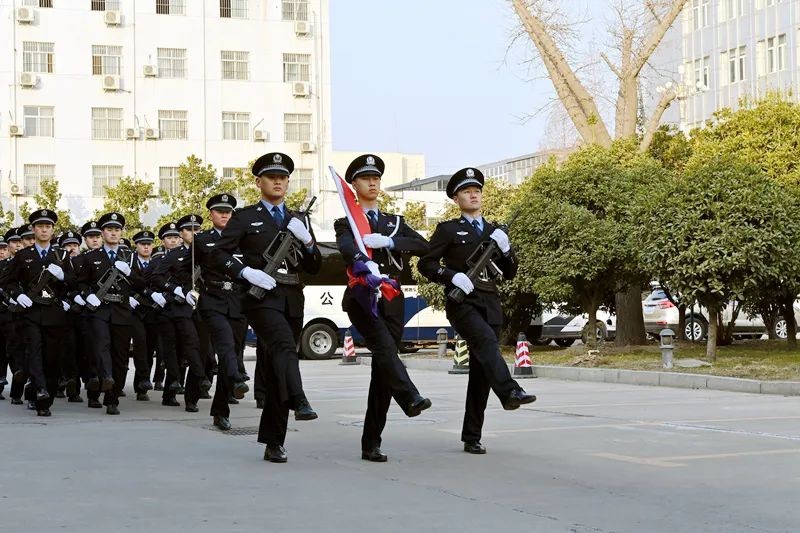 上午9时,庄严的升警旗仪式正式开始,全体人员警容严整、整齐列队、精神焕发。28名仪仗队员迈着铿锵有力的步伐,护送中国人民警察警旗行进到升旗台。“向中国人民警察警旗敬礼!”随着号令,伴随着嘹亮的《中国人民警察警歌》,警旗迎着晨风和朝阳冉冉升起,全体民警目视警旗庄严敬礼。