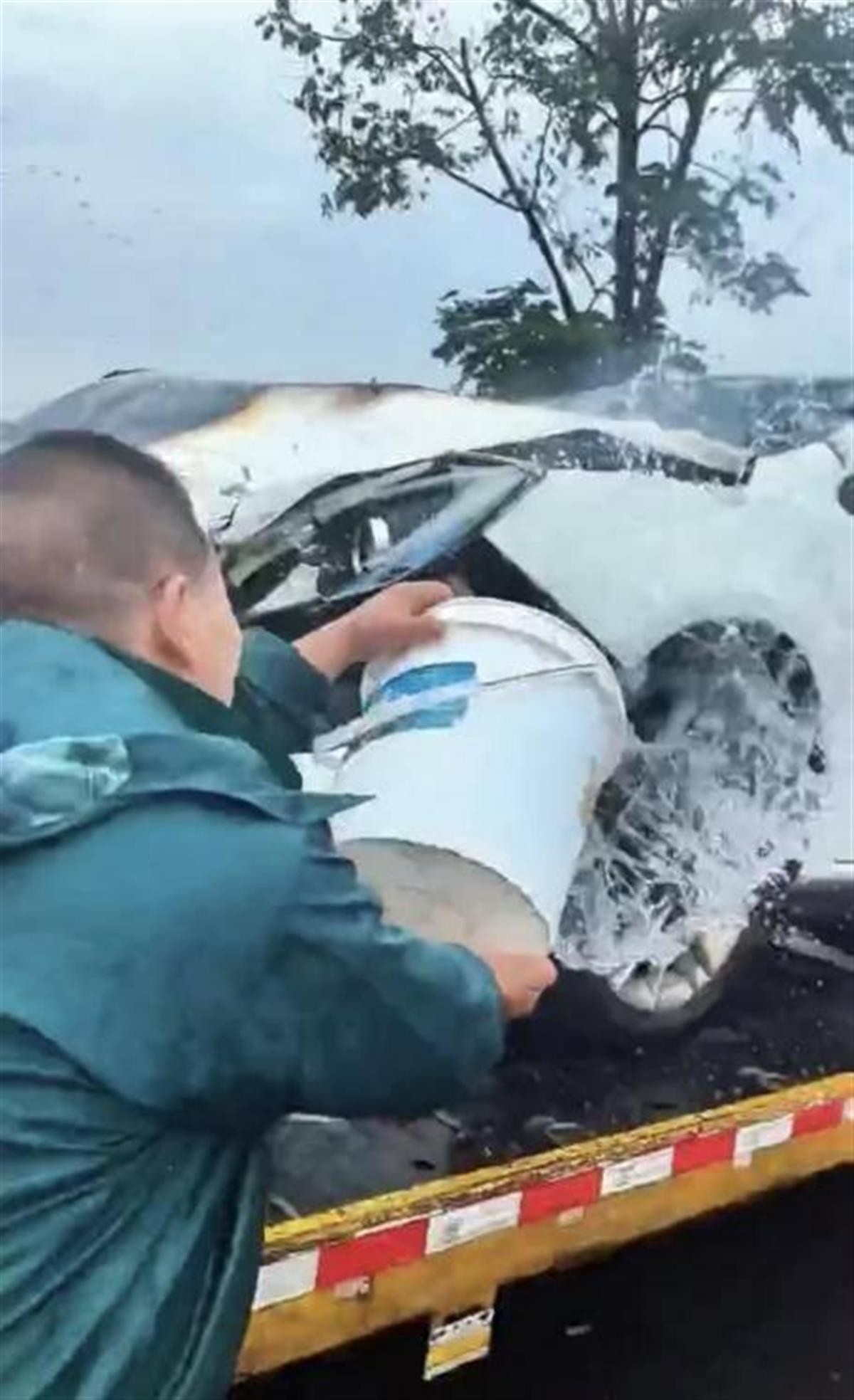 就这样,两人来来回回跑了30多趟,四个塑料水箱里的水加起来差不多有一吨,都被用得所剩无几。大约10分钟后,事故车火苗已基本被控制,消防救援车辆也赶到了现场及时处置。