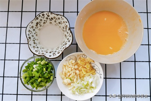 5.剩下的鸡蛋液中再打入一个鸡蛋;准备好的大葱,大蒜,生姜全部切成碎末;取少量的玉米淀粉加水调成水淀粉;最后将准备好的香葱切成葱花备用。