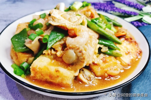 10. 最后将炒好的海鲜均匀地淋在豆腐上,再撒上一些葱花即可。
