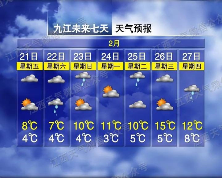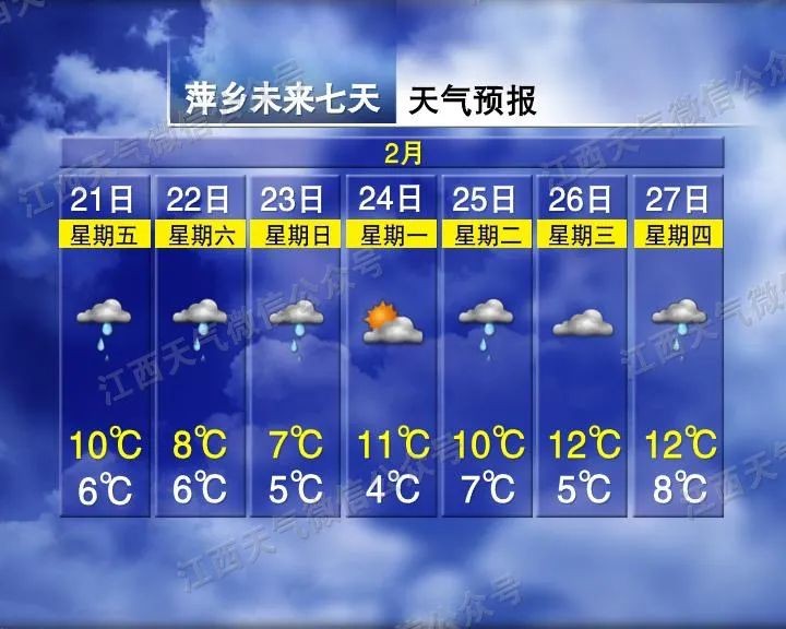 白天赣北阴天间多云,早晨局部地区有雾,赣中、赣南阴天,局部地区有零星小雨。晚上赣北、赣中阴天多云,部分地区转小雨;赣南阴天。明天最低温度:赣北、赣中5~7℃,赣南8~10℃。