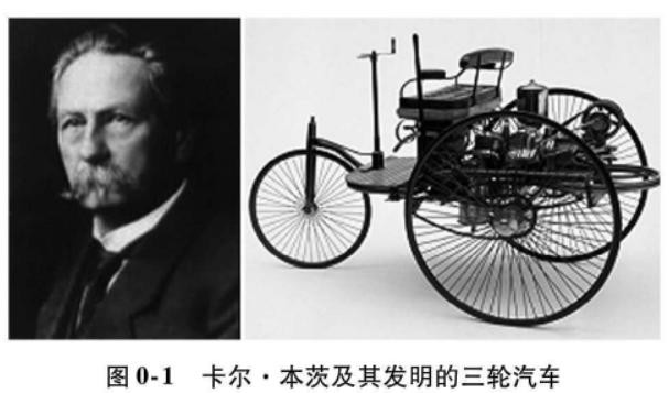 1885年,德国工程师卡尔·本茨在曼海姆制造出一辆装有0.85马力(1马力≈735瓦)汽油发动机的三轮汽车(见图0-1),该车最高速度为15km/h,这是世界上公认的第一辆汽车。1886年1月29日,本茨在德国取得了汽车专利证(NO.37435)。同年,德国另一位工程师戈特利布·戴姆勒也制造出一辆用1.1马力汽油发动机作为动力的四轮汽车(见图0-2),该车最高速度为18km/h,同年他还取得了船用发动机专利。
