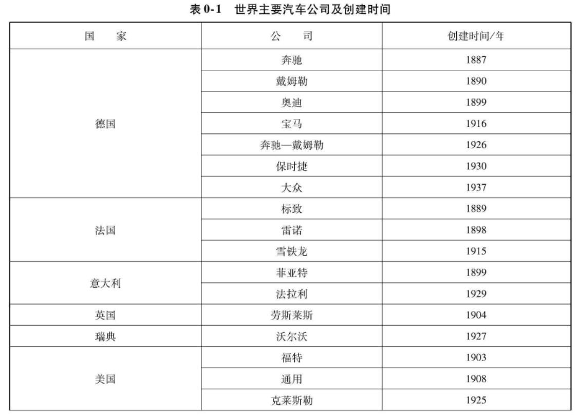 汽车起源于欧洲,欧洲是汽车工业的摇篮。100多年以来,世界汽车工业发展经历了从欧洲各国到美国-美国到欧洲各国-欧洲各国到日本-发达国家到发展中国家的4次大转移;现在,汽车工业已遍布全球各大洲,并成为世界首屈一指的产业。世界主要汽车公司及创建时间如表0-1所示。