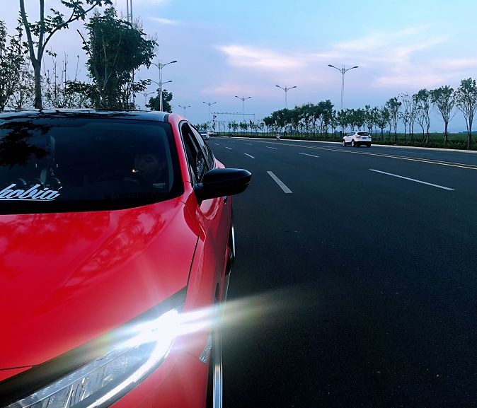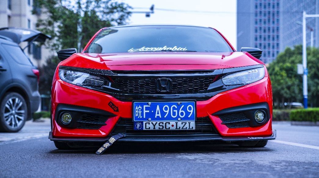 在外观上面眼前这辆十代思域上了一套车衣裳亮红改色膜,在前脸部分去掉了老气的镀铬中网,更换了蜂窝中网加上PP的前铲,加上一抹蓝的大灯总成,相比原厂看上去显得更加犀利有神。
