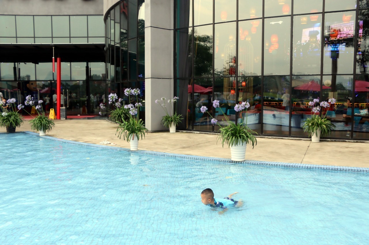 水非常浅,水高只有大人的小腿那么高。小锟玩的超开心,不过他似乎已经不太喜欢这种没有挑战性的高度,他喜欢另外一边的泳池,水高差不多到了他的腋下,这个泳池也有比较深的地方,中间有一条绳子隔开,小锟很聪明,知道绳子另外一边水比较深,因此他从来不会越线。
