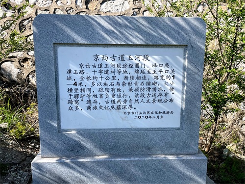 古道入口的右手边,立有两块标识碑,两块标识碑均是门头沟文旅局设立的。一块是京西古道玉河段——京西古道历史文化资源保护碑,一块是京西古道玉河段介绍。