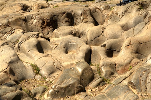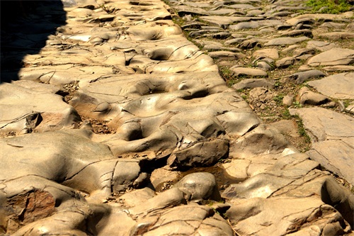 顺着古道由西往东大约步行两三公里,就是京西古道玉河段的精华,号称古道明珠的马蹄窝奇观。这一段削山开出来的路段,长约20米,宽在1.5-2米,全部是一体的沉积细砂岩,石质坚硬细腻,在路面上散步着有清晰的蹄窝百余个,左右交替大致分为两行。据司马迁《史记·五帝本纪》记载,黄帝披山通道之理拓修而成,长19.5米宽不足2亩的山体石道上,因年深日久,碑骡马铁蹄踏出深浅不一的蹄窝印痕150余个,世所罕见,是不可再生极为珍贵的古道文物。