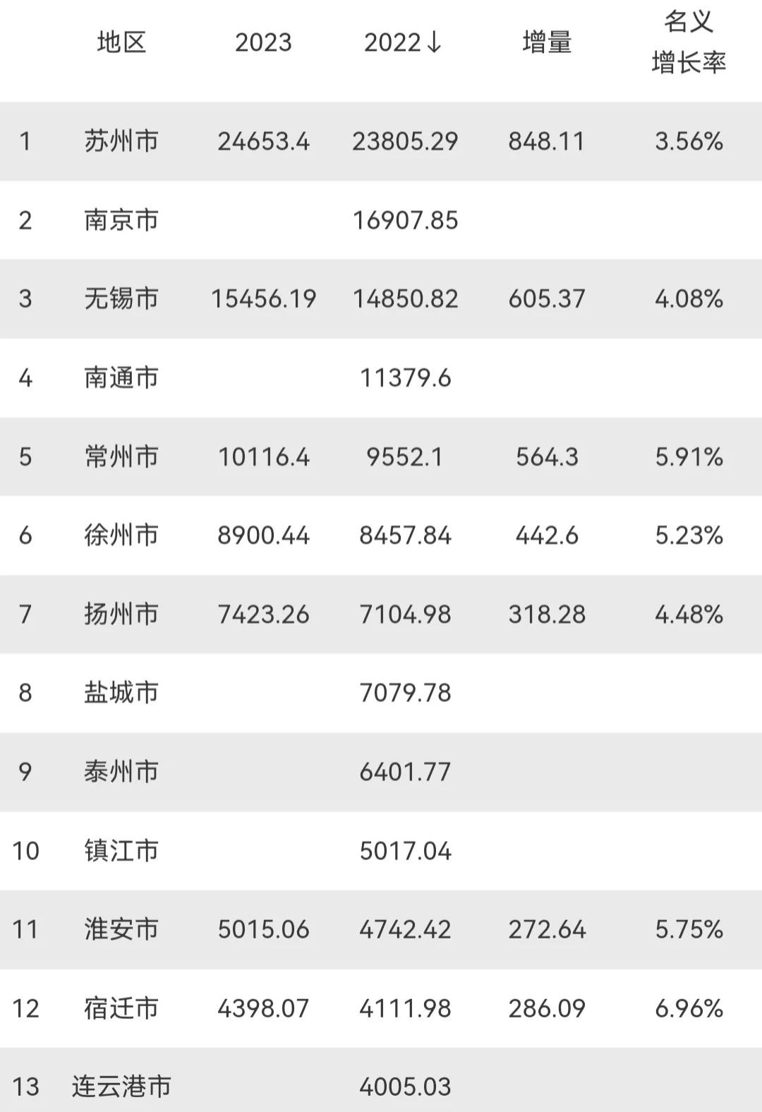 2023年江苏13市GDP:苏州近2.5万亿,常州第5,淮安超5000亿