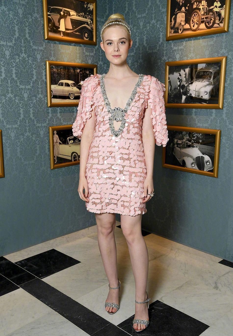 艾丽·范宁身着粉色亮片连衣裙,低低的衣领下,隐隐可见其迷人事业线,增添了几分小性感,精美的珠宝式镶边装饰在胸前,吸睛醒目,增添了落落大方的高贵气质感。