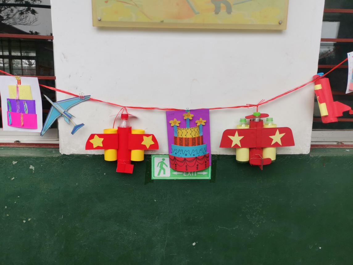 创意就有创新,孩子们放飞想象的翅膀,与自己的家长合作,做出了一个个独具匠心的手工作品。有的孩子给瓶子脱去外包装纸,穿上五颜六色的"彩衣",做成了美丽的小飞机;有的孩子运用刚学习过的立体图形的拼搭,用几个圆柱做了个精致的小蛋糕;还有一些同学运用便利贴和彩纸,做成了一个个蛋糕卡片。