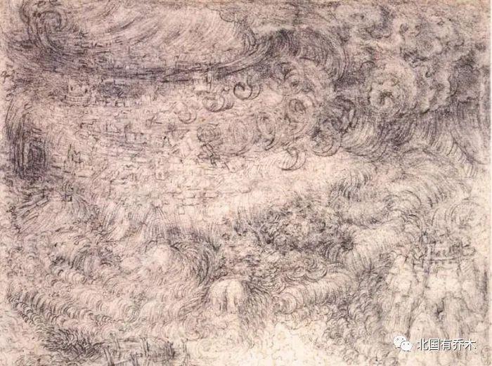 像这样的洪水素描大约有10幅,虽然画作都是一些线条但都能看出大洪水对不同环境的影响,有的画上树木被洪水连根拔起,有的画上人群在洪水中哀嚎,那这位天才他到底想表达什么呢?