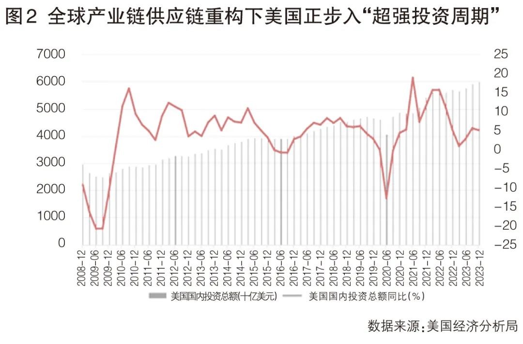 第三,中美各自对外贸易都发生转移。近年来,美国对华半导体、液化天然气和煤炭出口出现较大程度大幅下降,美国制造业“回流”,以及推动供应链“近岸化”、“友岸化”,使得一些产品的进口转向了中国以外的来源地。而中国也将部分外国商品采购从美国转向其他地区。2023年以来,中国对东盟、墨西哥等国的中间品、资本品出口增长较快,与东盟等新兴经济体产业链关系更加密切。这些情况表明中美各自对外贸易都发生了转移,也说明关税虽然改变了中美双边贸易额,却并未显著改变两国在世界贸易格局中的地位,受拜登政府大规模产业补贴以及产业链供应链回流因素影响,美国过去两年进入了“超强投资周期”(见图2)。