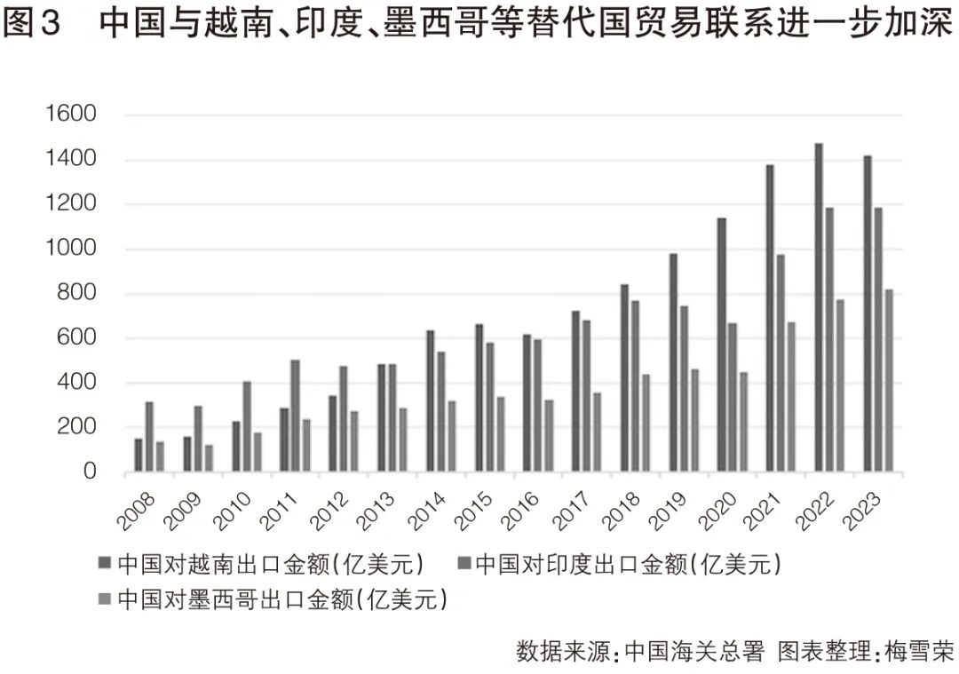 从中美直接贸易关系角度看,美国“友岸外包”、“近岸外包”等政策效果凸显。但从中美间接贸易角度看,中美“脱钩”并非易事,且增加了贸易成本,损失了效率,也使得全球产业链价值链供应链之间紧密相连的分工协作秩序遭到破坏。根据美国全国经济研究所2023年的研究报告测算,2017—2022年,美国从中国进口份额每下降1%,从越南进口的单位价格上升2.0%,从墨西哥进口单位价格上升0.6%,从韩国、新加坡、中国台湾等亚洲地区进口的价格上升0.5%。