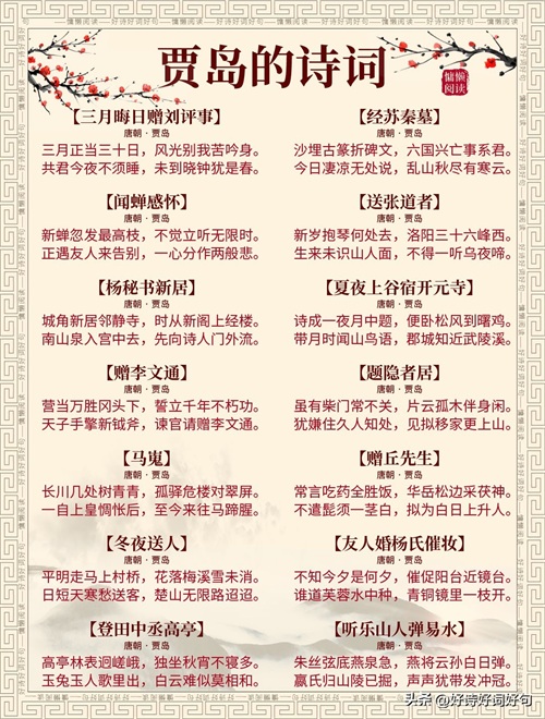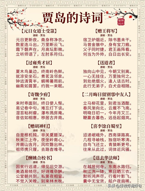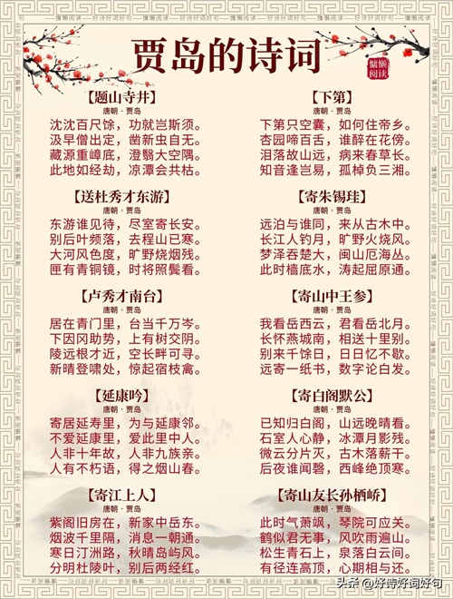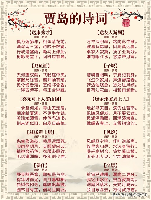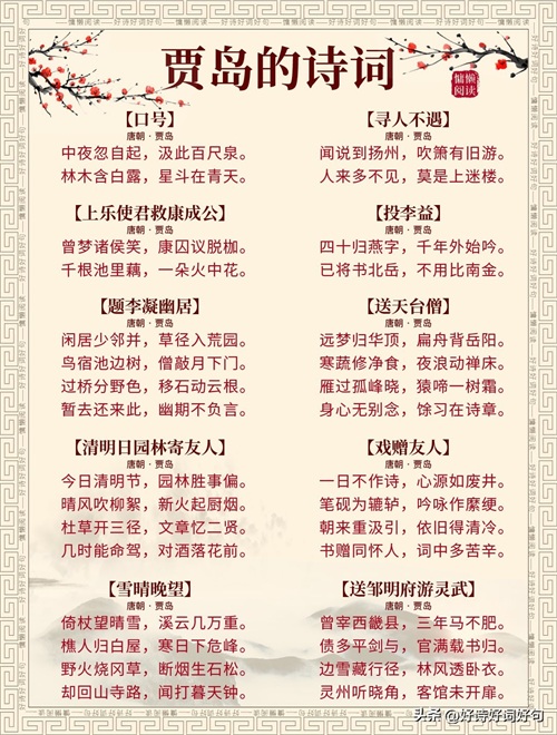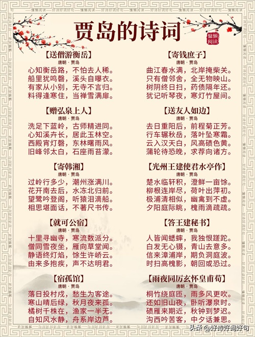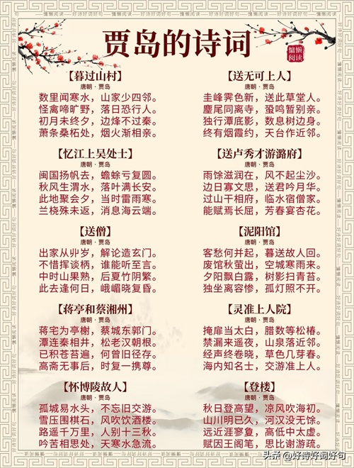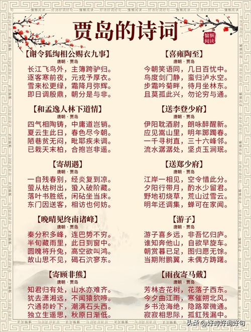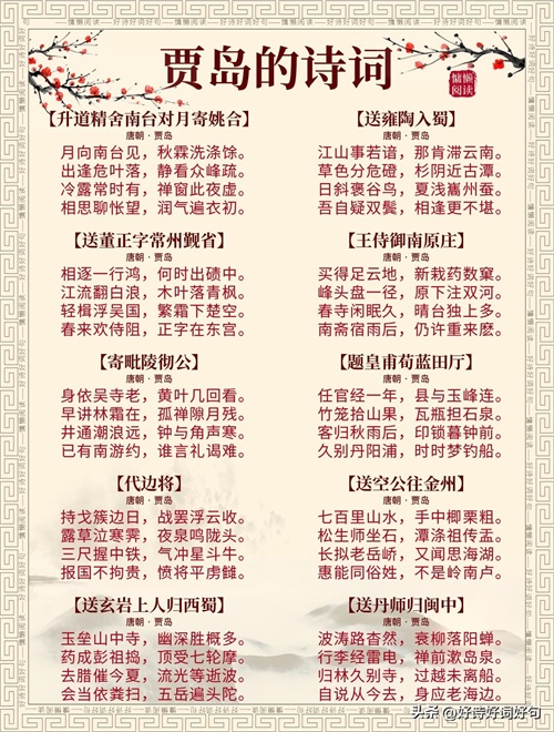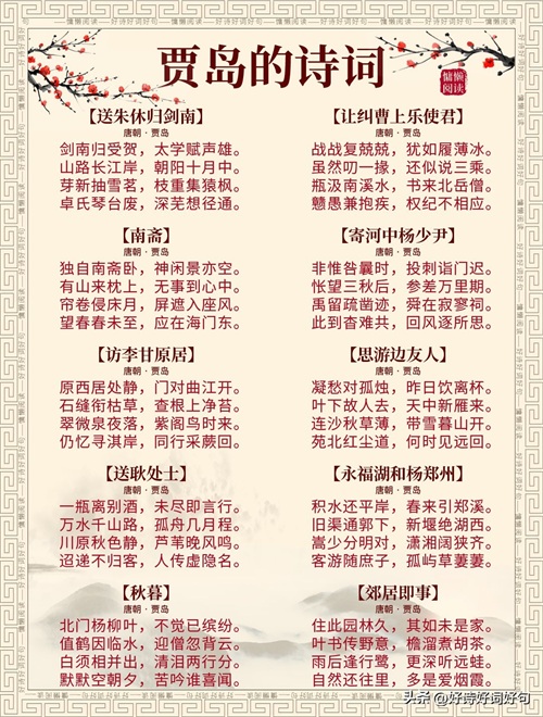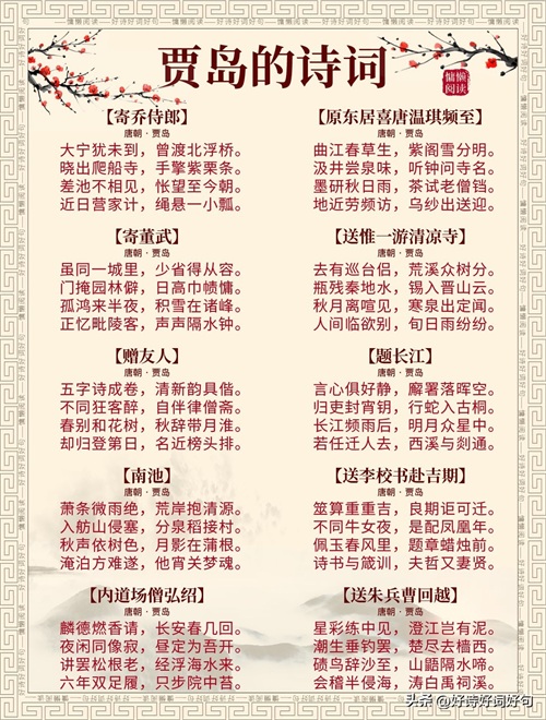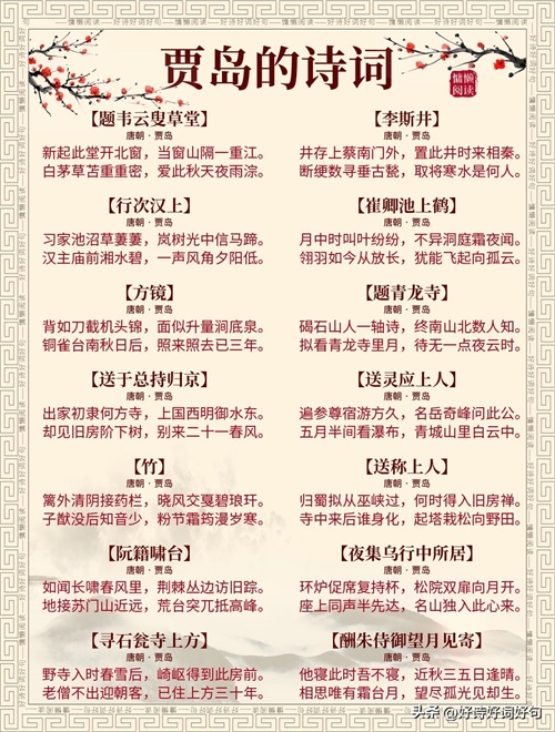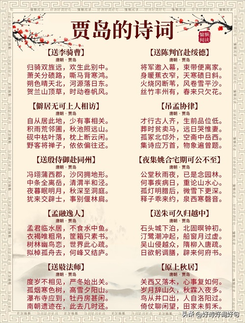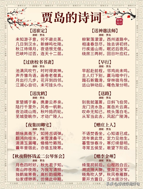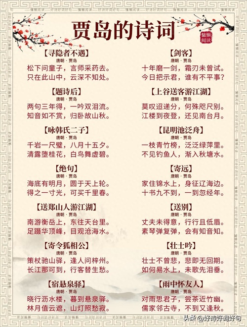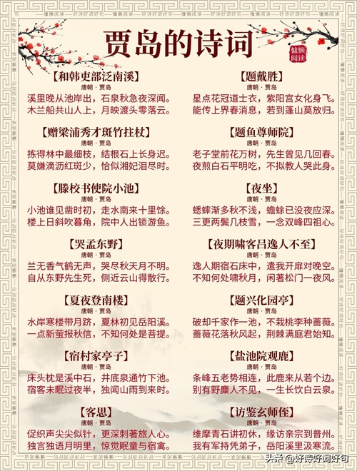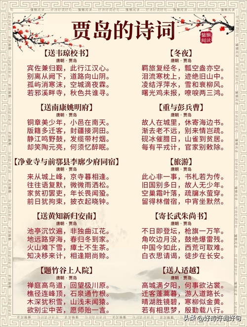 唐代诗人贾岛诗词每首都惊艳千年,值得收藏起来,值得一读;您还知道贾岛哪些诗词,一起分享,一起学习……