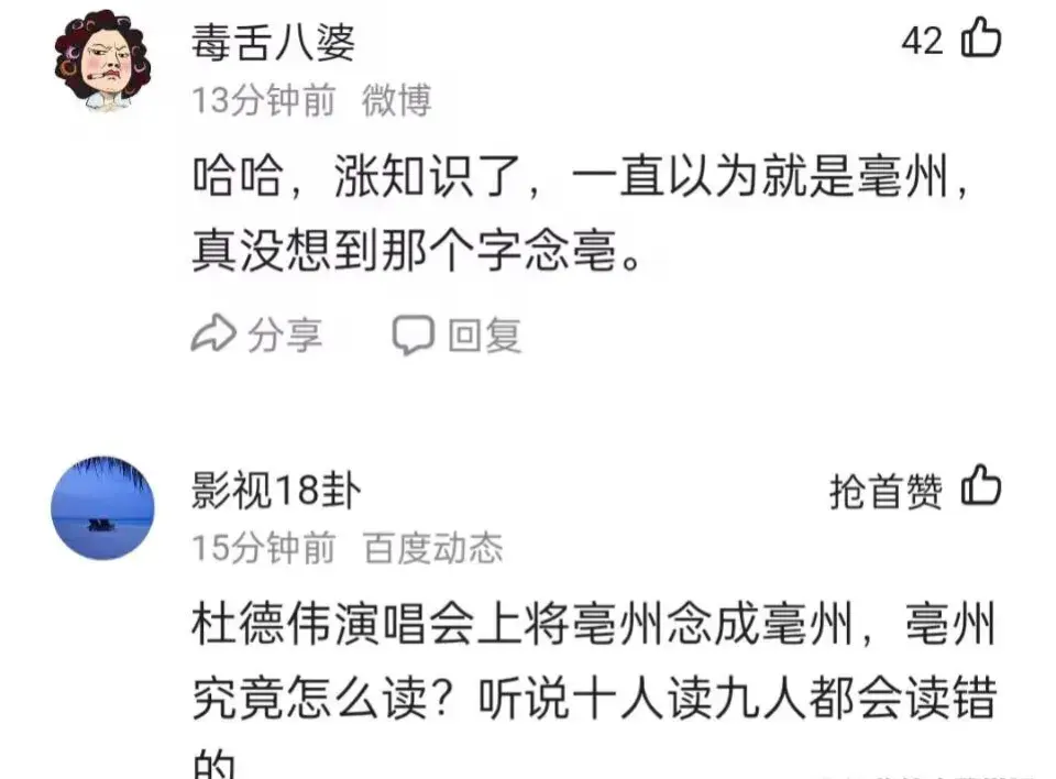 据了解,杜德伟在演唱会上读错地名后,现场观众纷纷纠正,而杜德伟也很快更正了发音。这也引起了网友们的讨论,有网友表示,自己一直以为这个地名就是“毫州”,而从来没有注意过正确的读法。