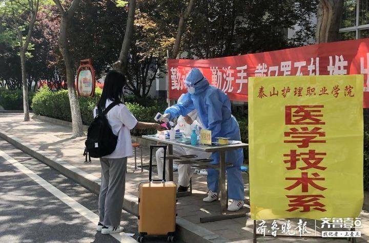 5月20日,泰山护理职业学院新校区迎来首批返校学生,校门口工作人员紧张有序,查验学生健康码、学生证,为学生测温、手消毒、分发口罩……