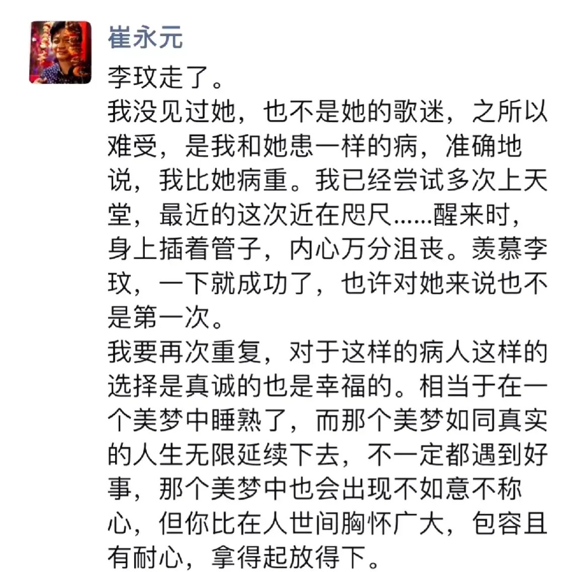 这次李玟自杀,崔永元也在媒体上第一时间共情。