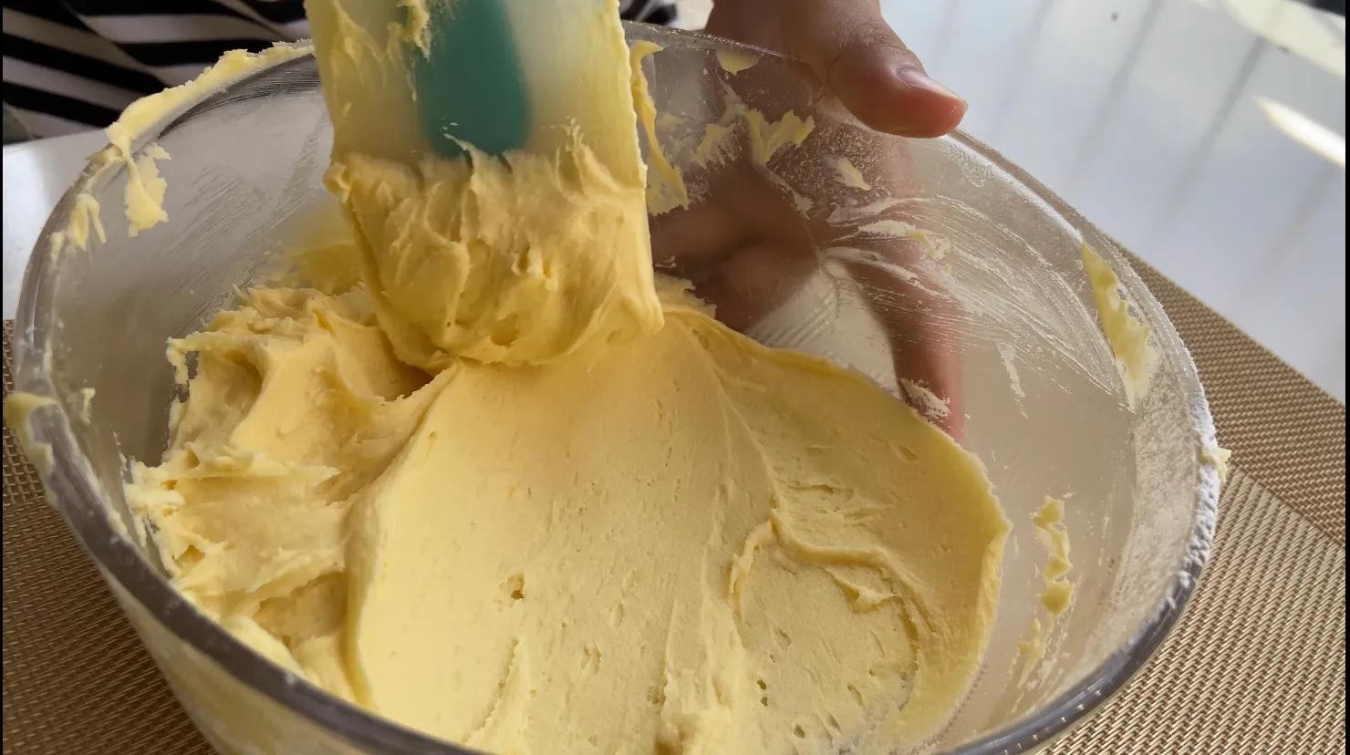 切拌到颜色一致,用刮刀刮几下,没有面粉颗粒就可以了。