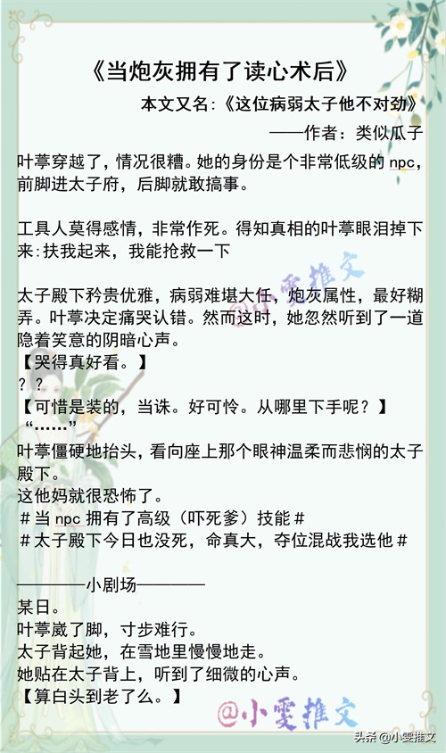 作品简评:一朝穿越成为攻略世界里的工具人,命运跟太子捆绑在一起,意外点亮读心术技能,在太子府里斗智斗勇,与太子日久生情,携手共进,最终修成正果。本文是一本轻松向的宫廷文,人物塑造饱满,情节跌宕起伏,感情细腻,故事生动有趣,引人入胜。行文流畅,诙谐。