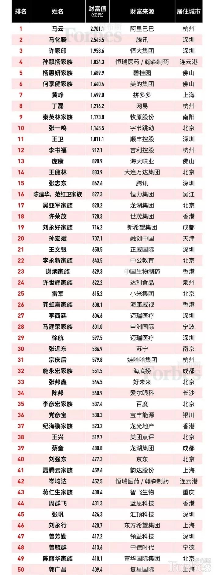 11月7日,福布斯发布2019年度中国富豪榜显示,400位上榜富豪的总财富比一年前增长超两成至9.12万亿元。