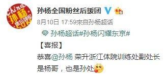 孙杨官方粉丝后援会也通过微博发出“喜报”,间接确认了这一消息。