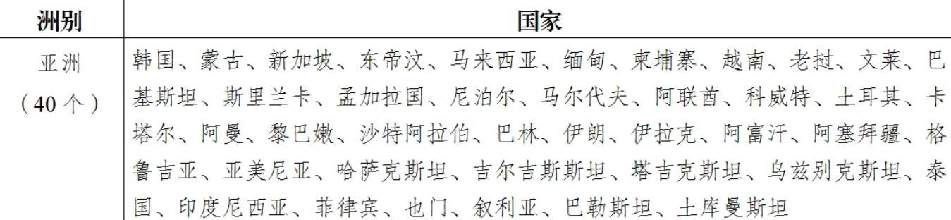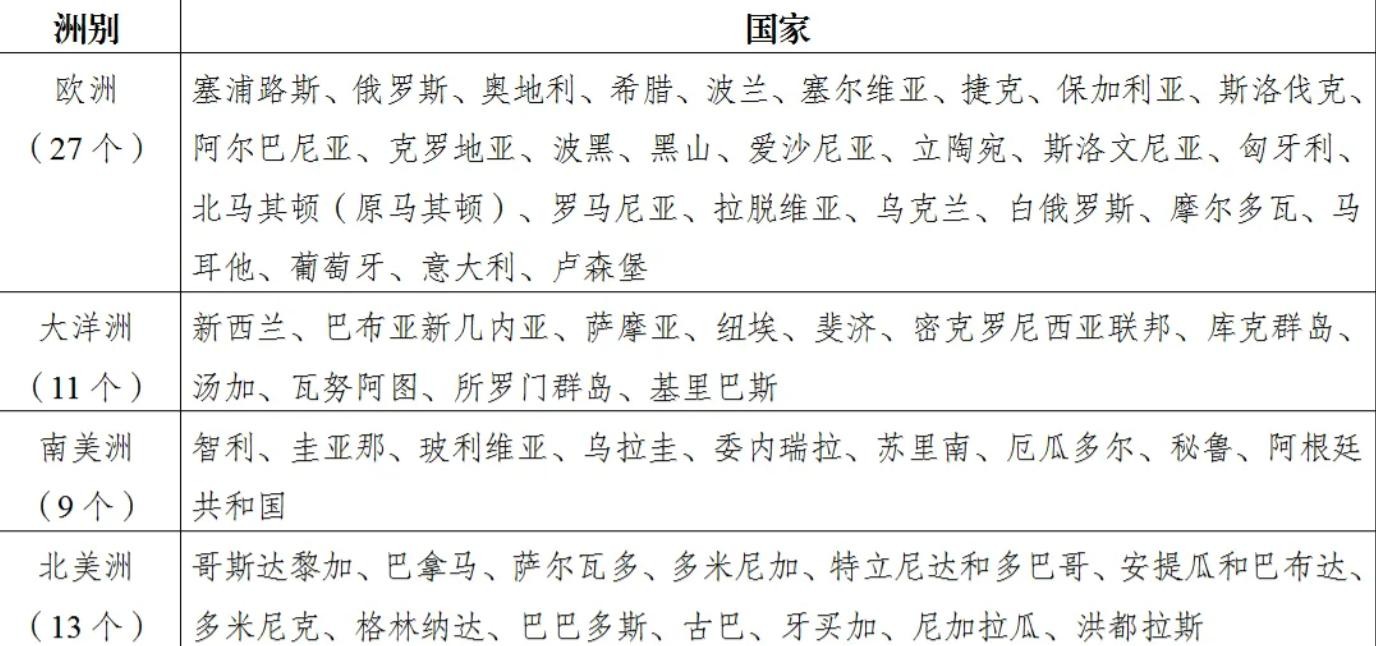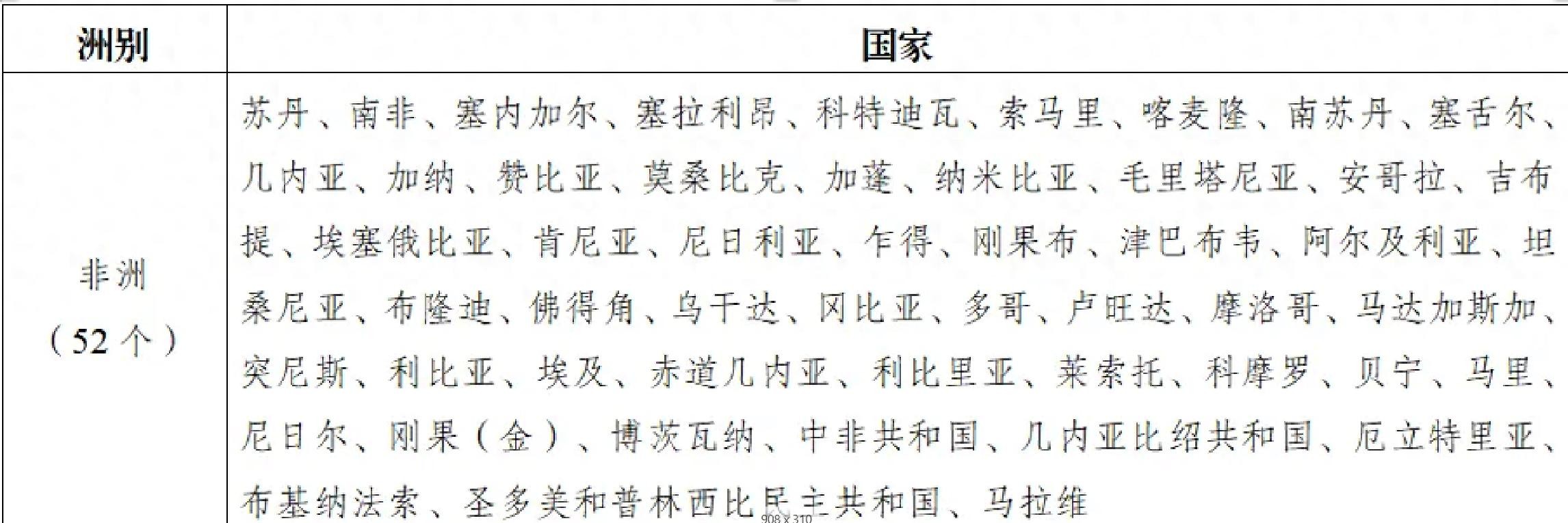 其中非洲国家有52个,亚洲国家有40个,欧洲国家有27个,大洋洲国家有11个,南美洲国家有9个,北美洲国家有13个。