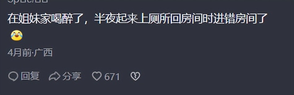 5、“在姐妹家喝醉了,半夜起来上厕所回房间时进错房间了”