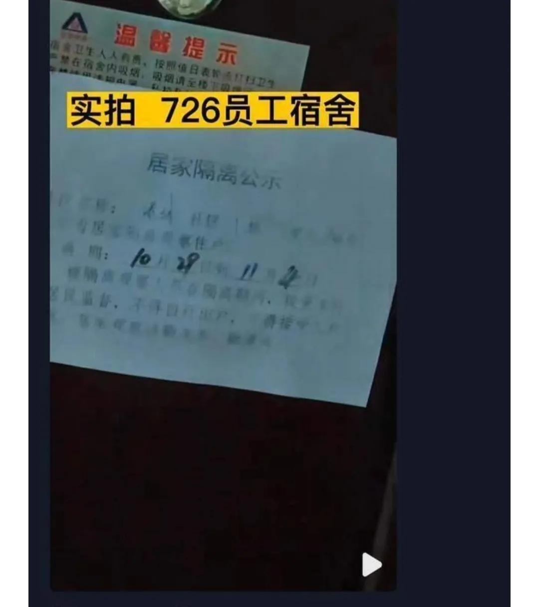 不过从富士康里面员工拍摄的画面可以看到,726宿舍门口已经被贴上了封条,隔离时间从10月29日至11月4日,隔离7天。这并不能说明里面的人已经死亡了,但可以肯定的是726宿舍确实感染了新冠病毒。