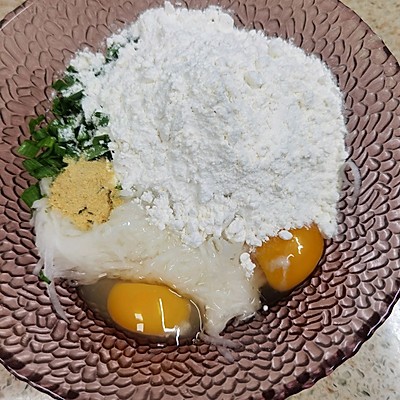 2、加入鸡蛋2个(蛋液约80克)盐2.5克,虾粉5克,普通面粉100克,纯牛奶30克,大蒜叶20克(用葱花也可以,我今天只有蒜)