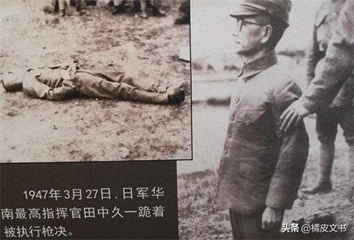 1947年3月27日,在广州市,日军华南最高指挥官田中久一跪着被执行枪决。二战中能被盟军活捉并被处决的日军中将以上将领少之又少,所以这张照片当时被广泛地刊登在国内外媒体上,直到今天这张照片仍然是全网被引用较多的抗日照片之一。 1947年3月27日,在华南地区横行8年之久,指挥部下长期残酷杀戮、迫害广东人民,被称为“华南之虎”的华南 派遣军第二十三军司令田中久一被中国战区判处死刑。行刑那天广州市民奔走相告、纷纷守候在囚车必经之路上观看战犯的可耻下场。当载有田中久一的囚车驶来时,愤怒的广州市民发出了铺天盖地的怒吼与咒骂。田中久一在车上看到此情此景非常沮丧、怯懦的他几乎瘫坐在敞篷卡车上。昔日威风凛凛不可一世的司令官像一只小鸡一样被宪兵拖下汽车并跪着被执行枪决。