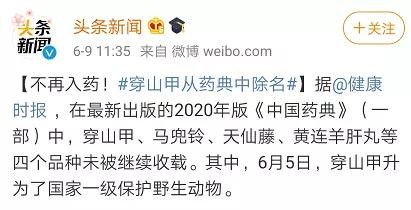 据悉,在最新出版的2020年版《中国药典》(一部)中,穿山甲、马兜铃、天仙藤、黄连羊肝丸等四个品种未被继续收载。其中,穿山甲于6月5日升为国家一级保护野生动物。