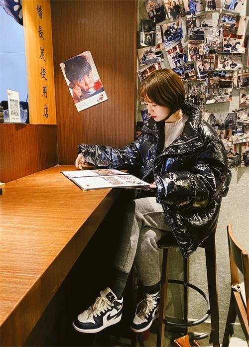 虽然是兼职的时尚博主但是她对于自己的清楚认知和对时髦元素、穿搭的把握还是很到位的,这件黑色面包服的打扮就挺新潮时尚的。这样的黑色“液体布料”挺有青春活力感的,简单地搭配一条牛仔裤、运动鞋,满屏都是青春的气息。