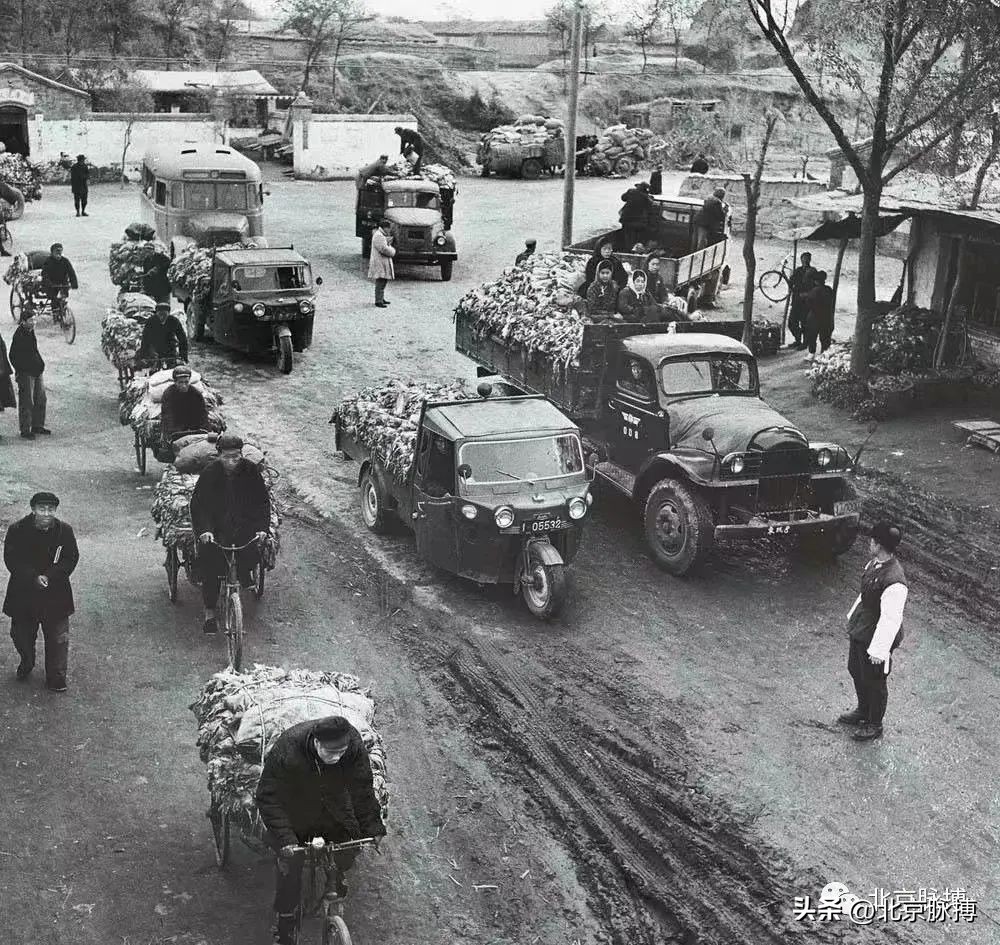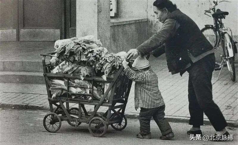 1978年,北京冬储大白菜季节的小脚老奶奶和帮助推车的孙辈